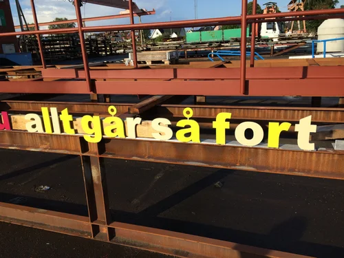 Big, small, painted, cut out in steel and stone. The text pieces are all in Swedish. The biggest on the top of the roof dimension 10 meters x 1.20 meters, says men vänta nu (but wait now, meaning: hold on a minute)others are; inte idag (not today) allt går så fort (everything is happens so fast) bara nu (only now) det går snart över (it will soon be alright) I alla fall inte här (at least not here) allt kommer nog att bli bra (everything might be alright) jag hinner inte med (I can't reach it, I can't make it in time) Posters were made to announce the project at the new building, with texts as: men vänta nu, jag hinner inte med, inte idag.